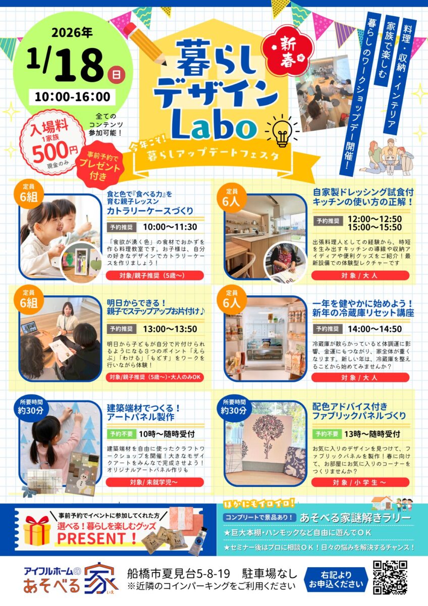 「暮らしを整えることで自分や家族を大切にする」をテーマにした体験型イベント「新春・暮らしデザインLabo」が、1月18日10時〜16時、体験型住宅「あそべる家」(船橋市夏見台5‑8‑19)で開催される。主催はアイフルホーム船橋店と、地域の専門講師らで組織された「暮らしデザインLabo実行委員会」。