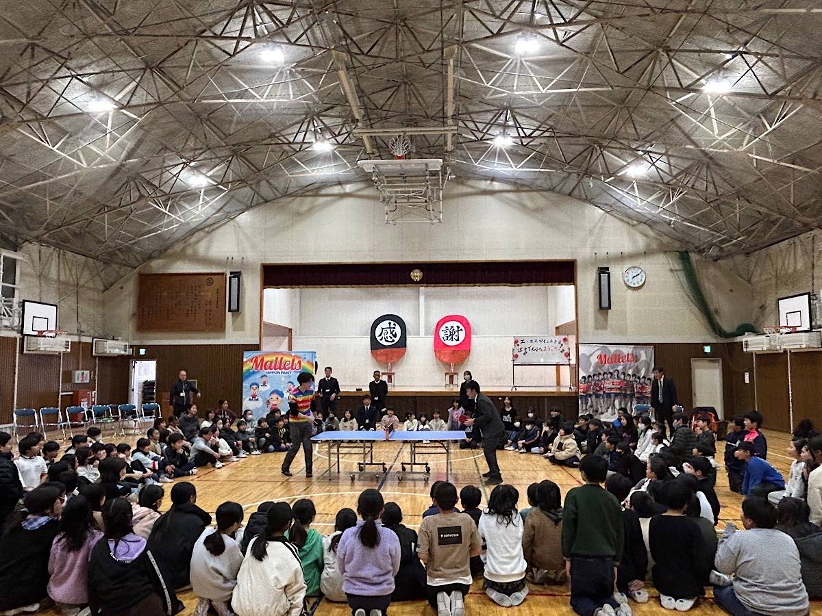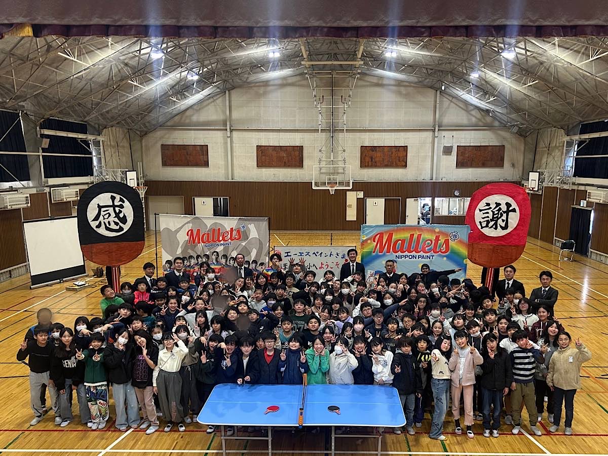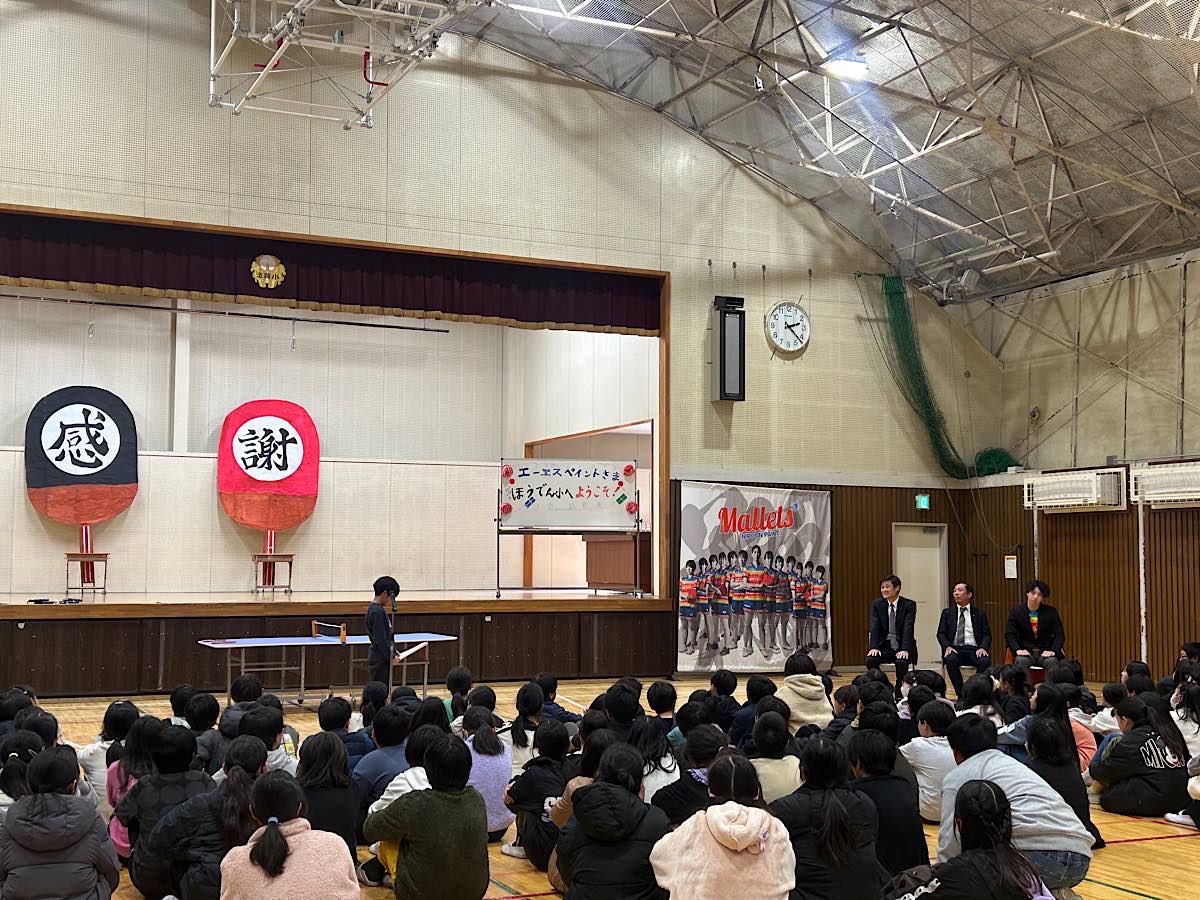 児童約150人が参加した寄贈式では、中野誠校長と常務執行役員であり事業推進本部長の松本顕さんによる目録贈呈授与の後、松本部長が「子どもたちの安全を最優先した卓球台を、末永くみんなで楽しく使っていただけると嬉しい。またTリーグでは3月まで今シーズンの試合があるが、1位とわずかな差で優勝を目指して頑張っている『日本ペイントマレッツ』を応援してほしい」と話した。