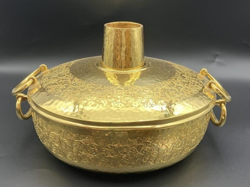 中でも目玉となるのが、東京・浅草の老舗「石川工房」(東京都台東区)三代目で金工芸家の石川光一さんが手がけた純金製のしゃぶしゃぶ鍋。唐草模様を細密に施したこの作品は、重さ約3.5キログラム、販売予定価格は2億円を超える。