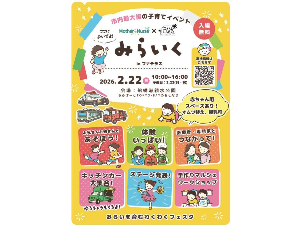 ららぽーとTOKYO-BAYのすぐ隣りにある船橋港親水公園(船橋市浜町2地先)で2月22日、子育てイベント「みらいくinフナテラス」が開催される。