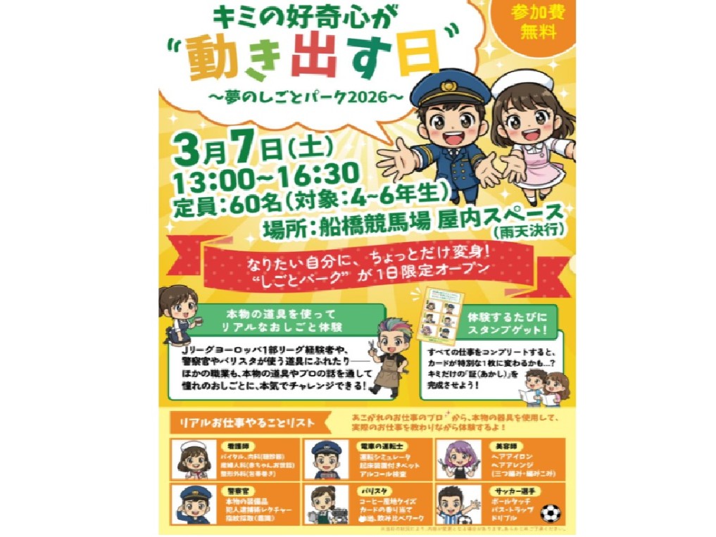 会場には船橋競馬場のVIPルームを活用する。全6種類の体験ブースを用意し、地元にゆかりのある企業や専門家が協力し、実践的なプログラムを展開する。6種類とは、船橋警察署の協力での警察官ブース、東日本旅客鉄道(JR東日本)の協力で電車運転士ブース、市内の医療従事者が集まり子育て家庭を支援する団体「マザーナース」の協力で看護師ブース、都内などで美容室を展開する「AMA TOKYO」から美容師ブース、「ドトールコーヒーショップ船橋駅南口店」の協力でバリスタ体験ブース、市船サッカー部卒業生で現在は千葉県で「ローヴァーズ」を経営する元プロサッカー選手カレン・ロバートさんによるサッカー選手体験ブースの6業種を用意する。