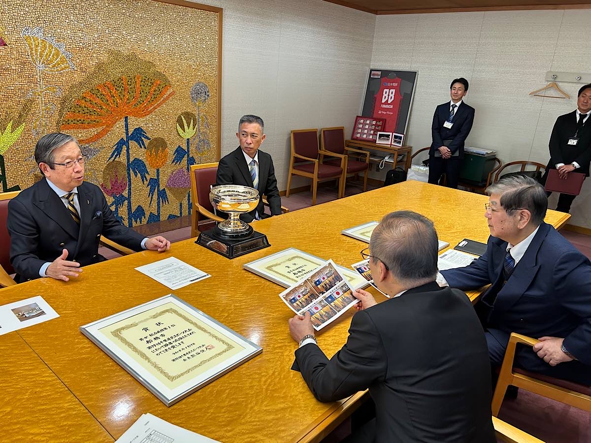 令和7年に開催された「第75回千葉県民スポーツ大会」において、船橋市選手団が男女総合成績で優勝したことを市長に報告するため、2月12日、選手団を代表して、船橋市スポーツ協会の山﨑幸男会長(船橋市選手団団長)と中野誠理事長(船橋市選手団総監督)が市役所を訪れた。