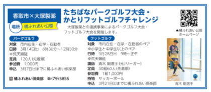 2026年3月14日(土)8:30〜12:30、橘ふれあい公園において、香取市内在住・在学・在勤者を対象に、たちばなパークゴルフ大会が開催されます。
