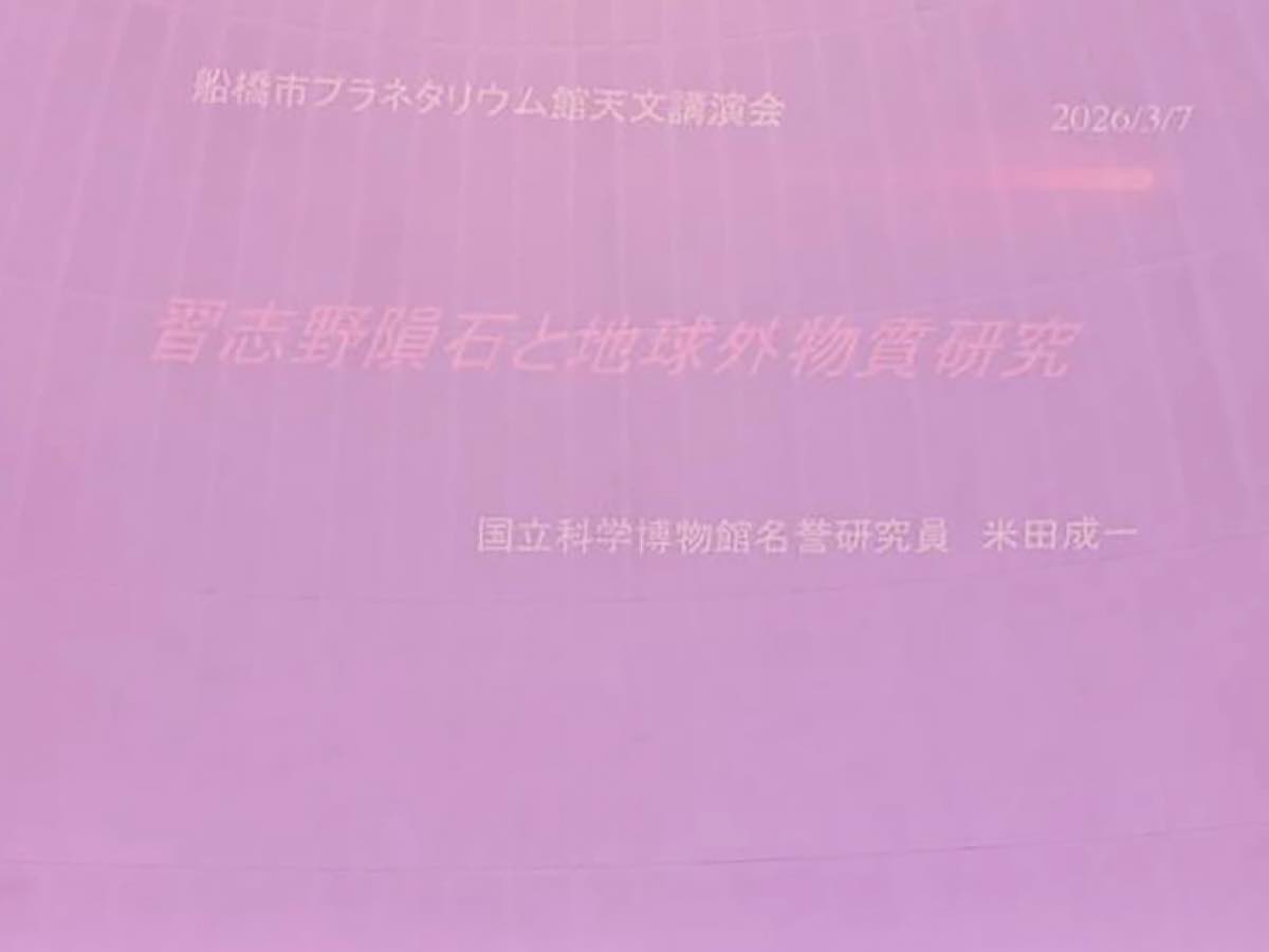 船橋市総合教育センター プラネタリウム館(船橋市東町834)で3月7日、国立科学博物館(東京都台東区)名誉研究員・米田成一さんによる「天文講演会 習志野隕石と地球外物質研究」が開催され、約70人の参加者が耳を傾けた。