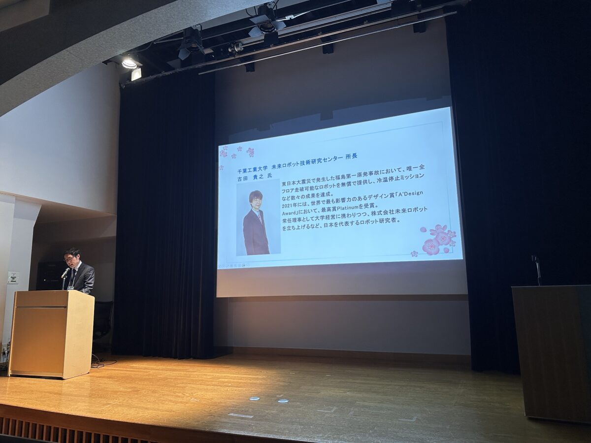 古田さんは福島第一原発事故で稼働したロボット開発の実績などを踏まえながら、仮想空間でAIを進化させて実機に応用する研究などを説明し、「ロボット技術は目的ではなく手段。技術を使って社会をより良くすることが大切」と語った。