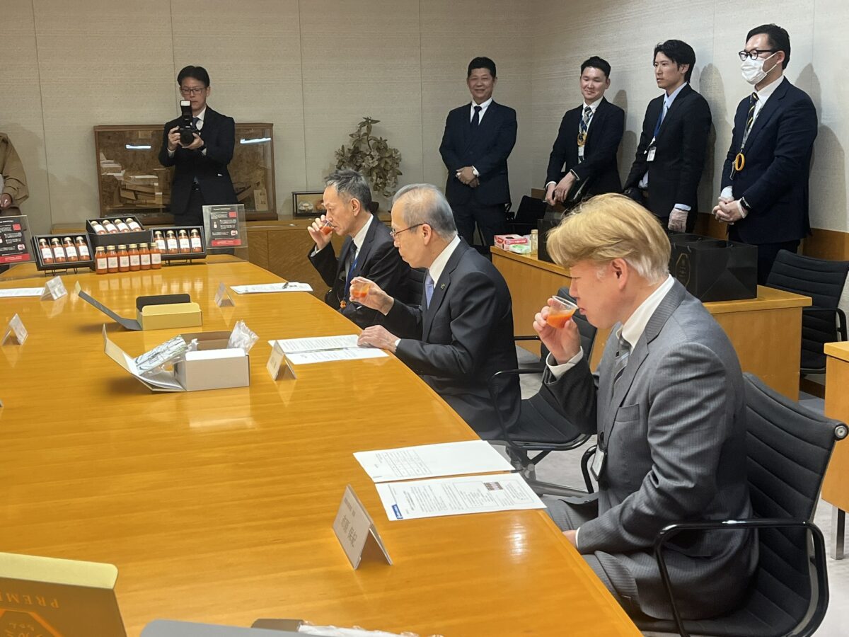 市内トマト農家「Dファーム」(船橋市馬込町804-1)はJAいちかわと共同で、特殊な農法で栽培された船橋産ミディトマトを100%使用したプレミアムトマトジュース「Premium トマトジュース」を開発、販売を開始したことから、3月12日、船橋市役所で松戸徹市長を訪問し、完成を報告した。