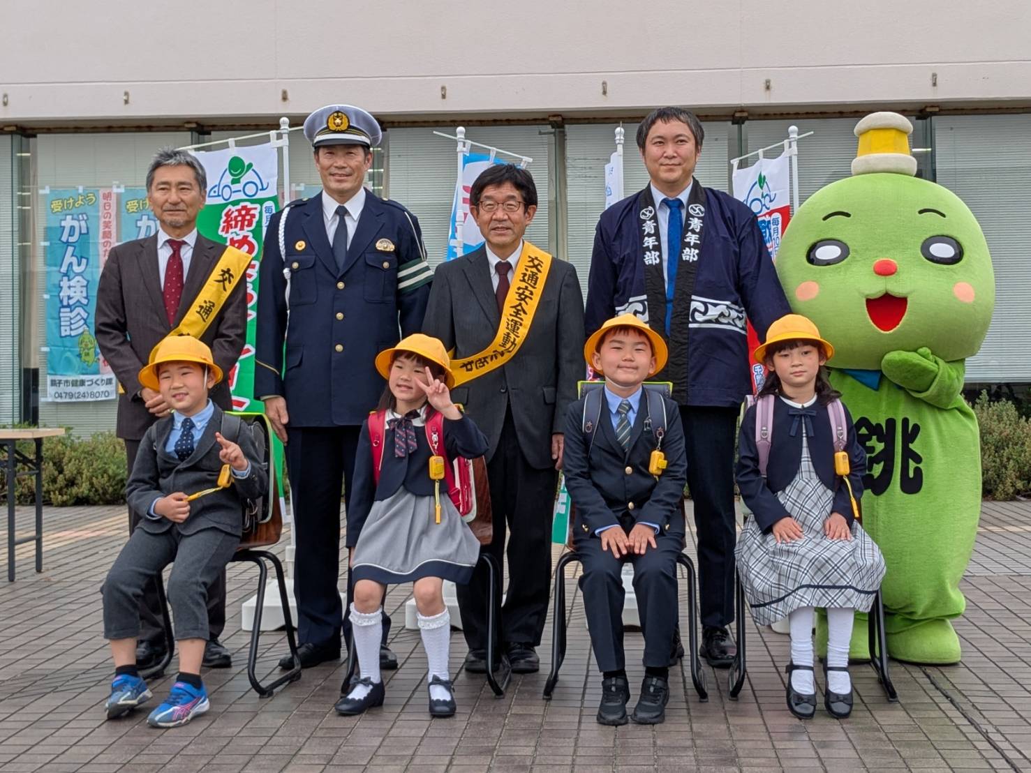 会場では、市内の小学校に4月から通う新1年生4人に対し、越川市長から交通安全帽子、伊藤警察署長から防犯ブザーを、銚子市公認キャラクター「ちょーぴー」からはちょーぴーがデザインされたランドセルカバーが贈られた。