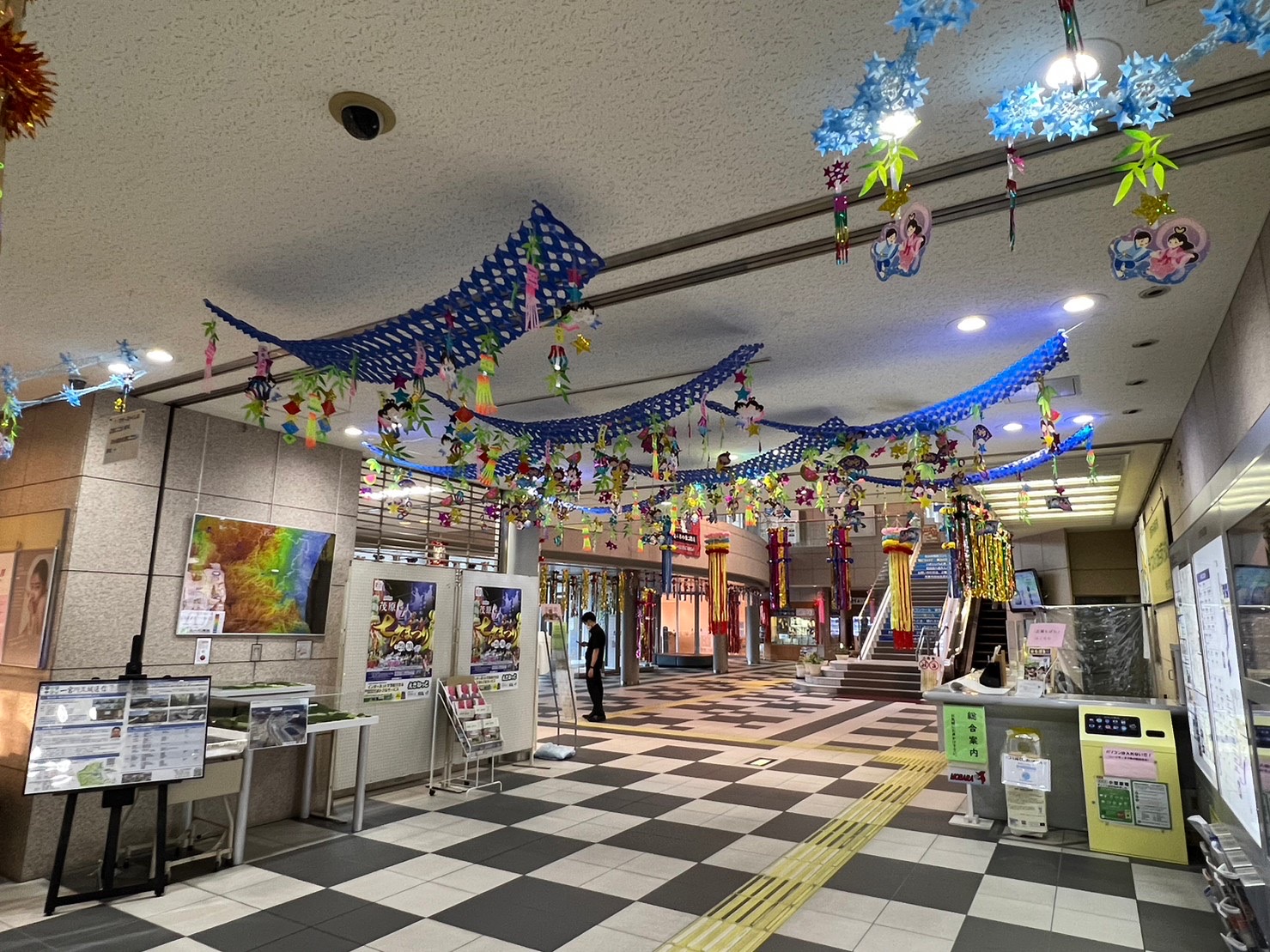 JR茂原駅。ひらひらと舞う大小の吹き流しが、七夕気分を盛り上げてくれています。