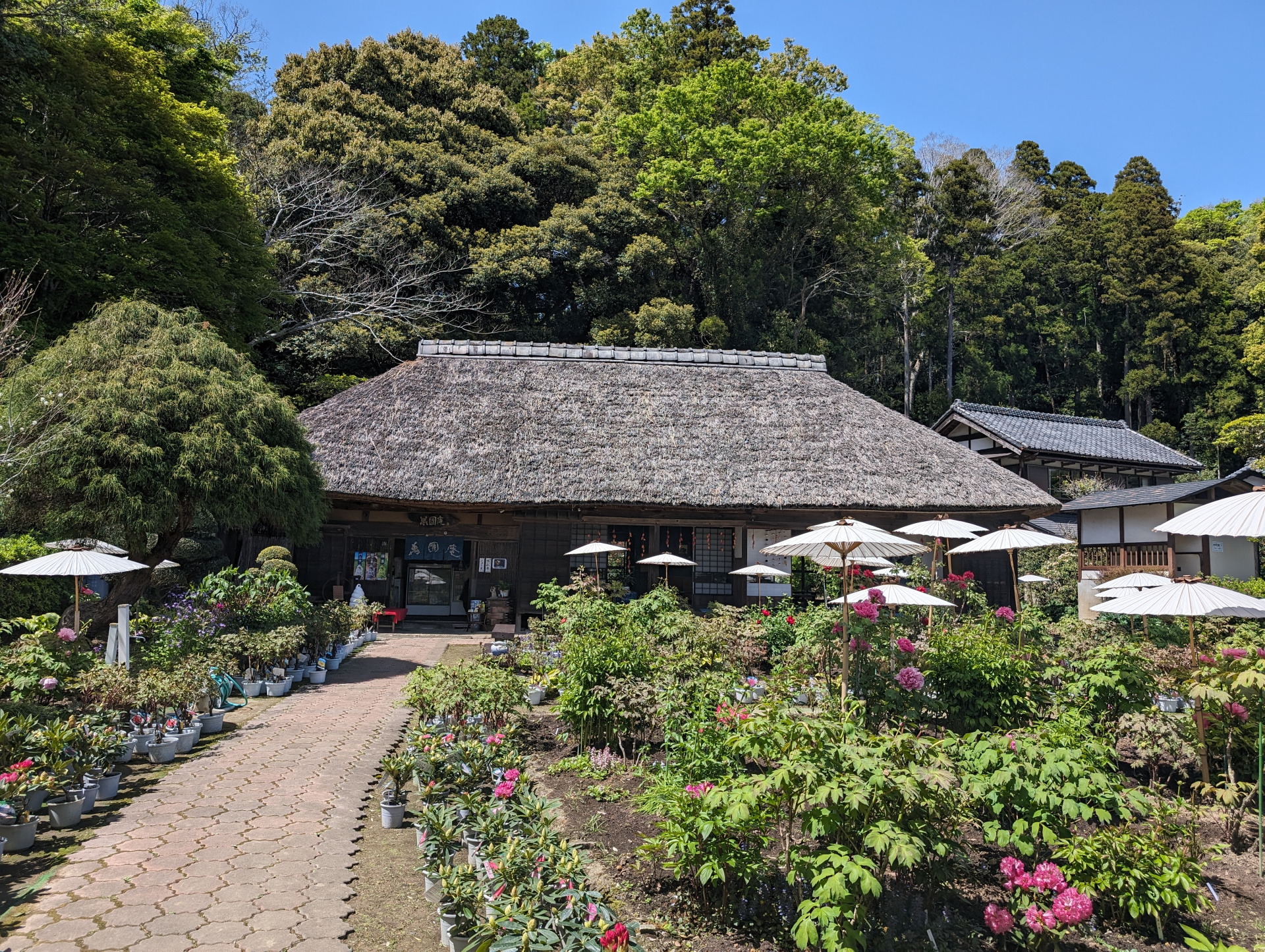 上総の里山景観、房総丘陵を背景にした古民家の広い庭園が「茂原牡丹園」として、一般公開されています。